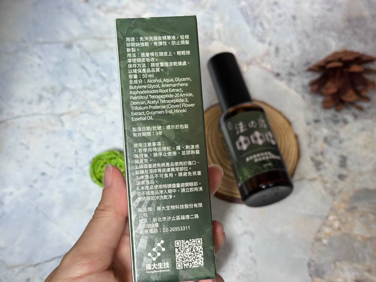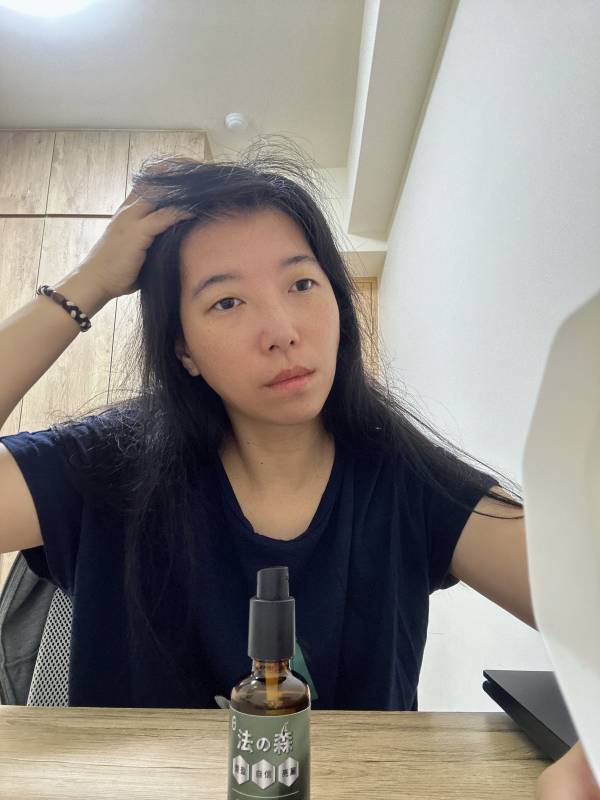聞起來居然有種檜木香氣,按摩頭皮的同時,也讓人身心放鬆。這是一罐免沖洗的頭皮精華液,使用方式是洗完頭髮並吹乾後,將精華液噴在頭髮少量的地方,(比如說髮縫明顯處)並適當按摩,隔天起床後再噴一次。每日1~3次較佳。